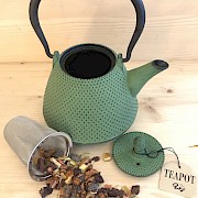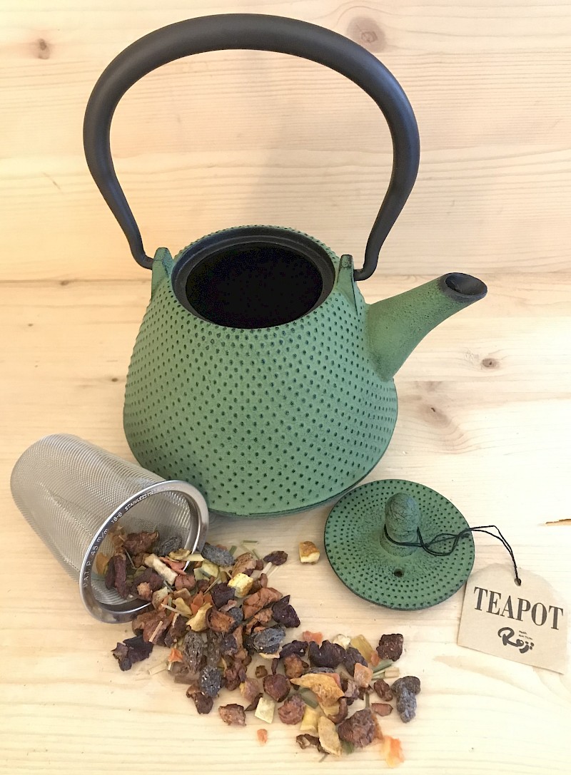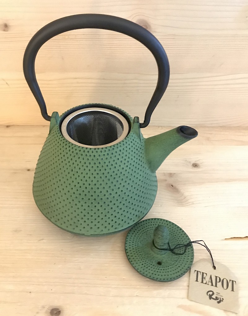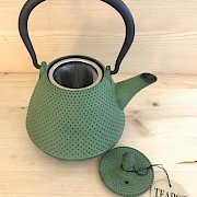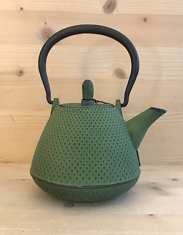 Teiera in ghisa giapponese Iwachu, con filtro inox da 500ml verde con rilievi puntinati neri, elegante realizzata a mano da Nanbu Iron Studio nella Prefettura di Iwate. Lavorazione artistica di alto design cha rende questo oggetto un piccolo capolavoro d'arte e tradizione. Prodotto da artigiani giapponesi specializzati. Indicato anche per la cerimonia del tè o per degustare cru di altissimo livello. Solida ed elegante, con finiture di pregio , smalti e colori di altissimo livello e di grande effetto. Una teiera Iwachu è per sempre. Vi ricordiamo che la colorazione viene praticata in sovrappiù dall'artigiano e che il colore si personalizza nel tempo in base all'uso. Ogni teiera pur essendo simile non è mai esattamente identica ed a suo modo è un pezzo unico!