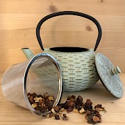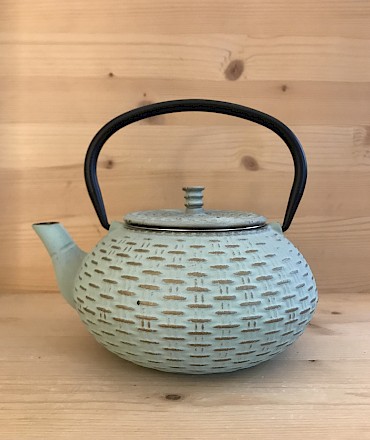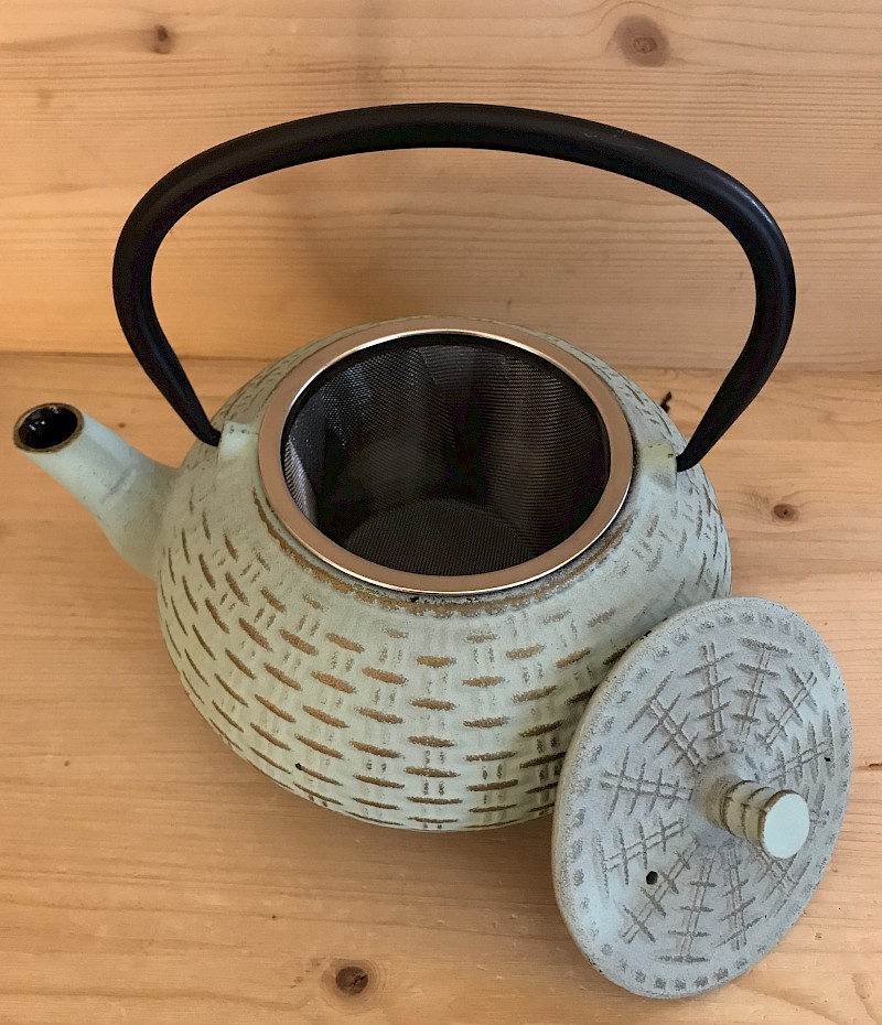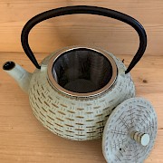 Teiera in ghisa di colore verde salvia e designe dorato in rilievo con interno smaltato, capienza da 800 ml con colino in acciaio inox.  Prodotta con vernici certificate ecologiche.