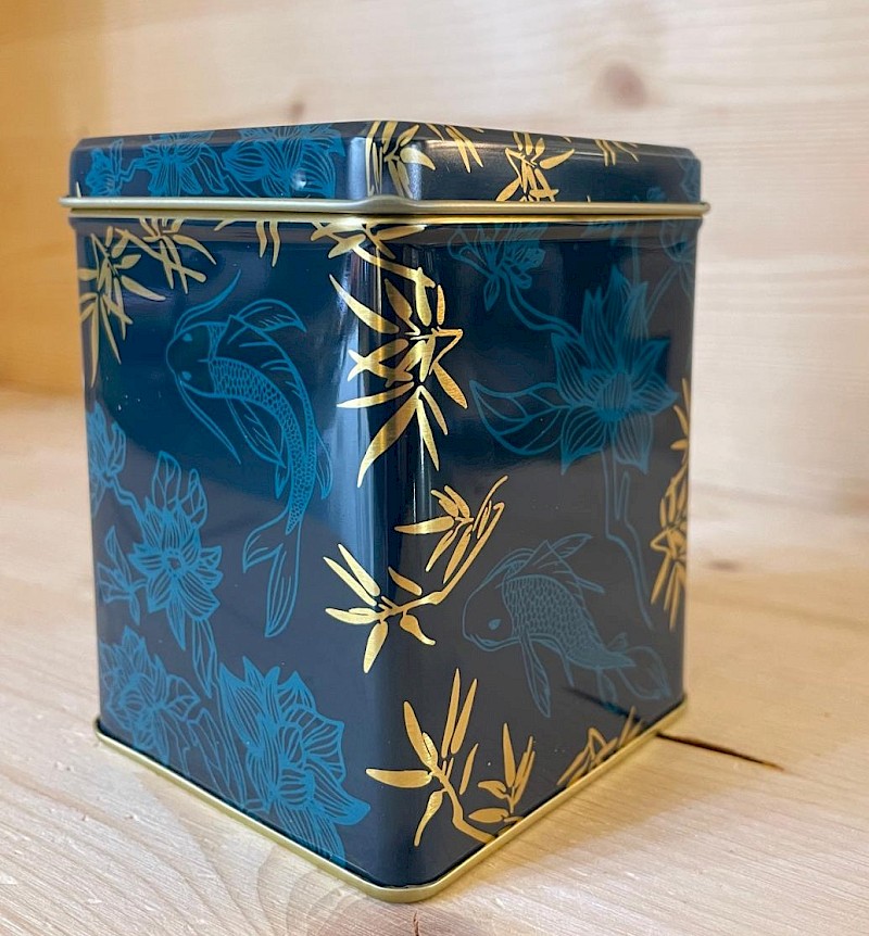 Lattina porta tè, tisana o infuso da 100 g fantasia Kioto blu con interni dorati.