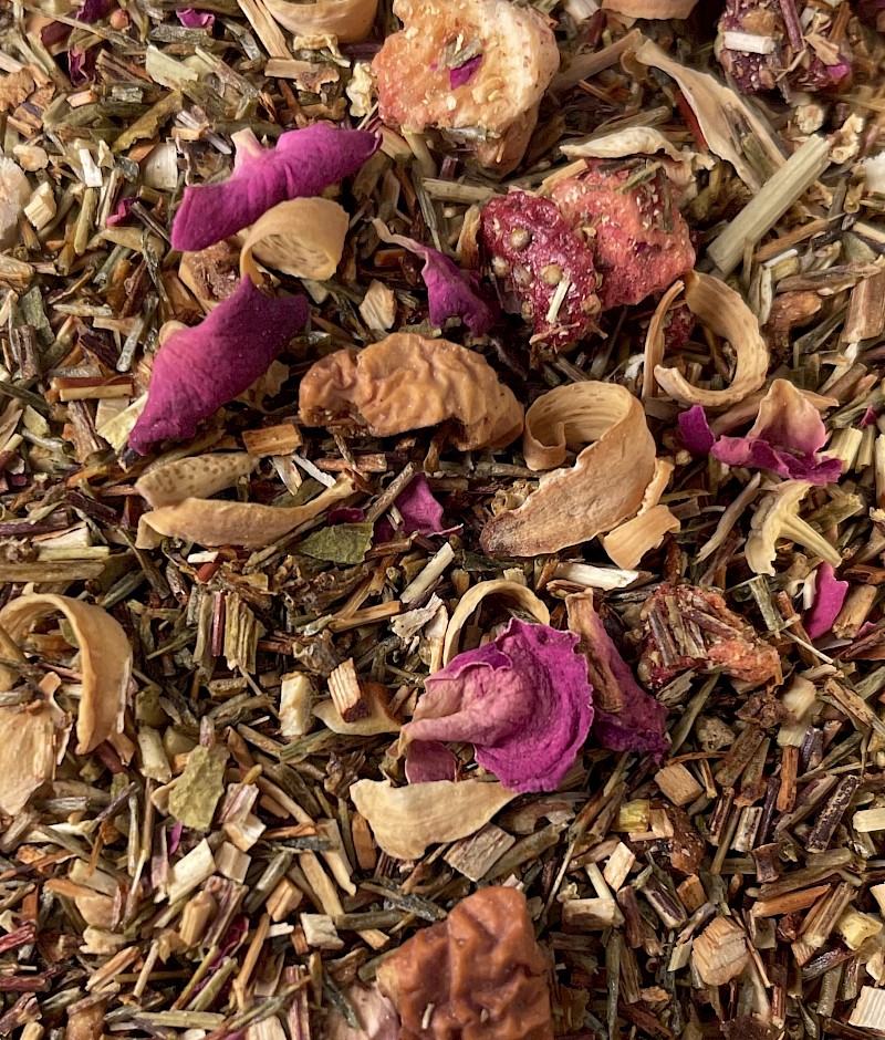 Il delizioso sapore fruttato della fragola e del kiwi e floreali dei petali del fior d'arancio, della rosa e del sambuco, si mescolano con le note naturalmente dolci, legnose e quasi mielose dei rooibos del Sud Africa. Un altro modo per assaporare un classico fino alle ultime ore del giorno. Il Rooibos è naturalmente privo di teina e questo fattore, unito al gusto molto gradevole, rendono questa miscela adatta a tutti, anche ai bambini.
